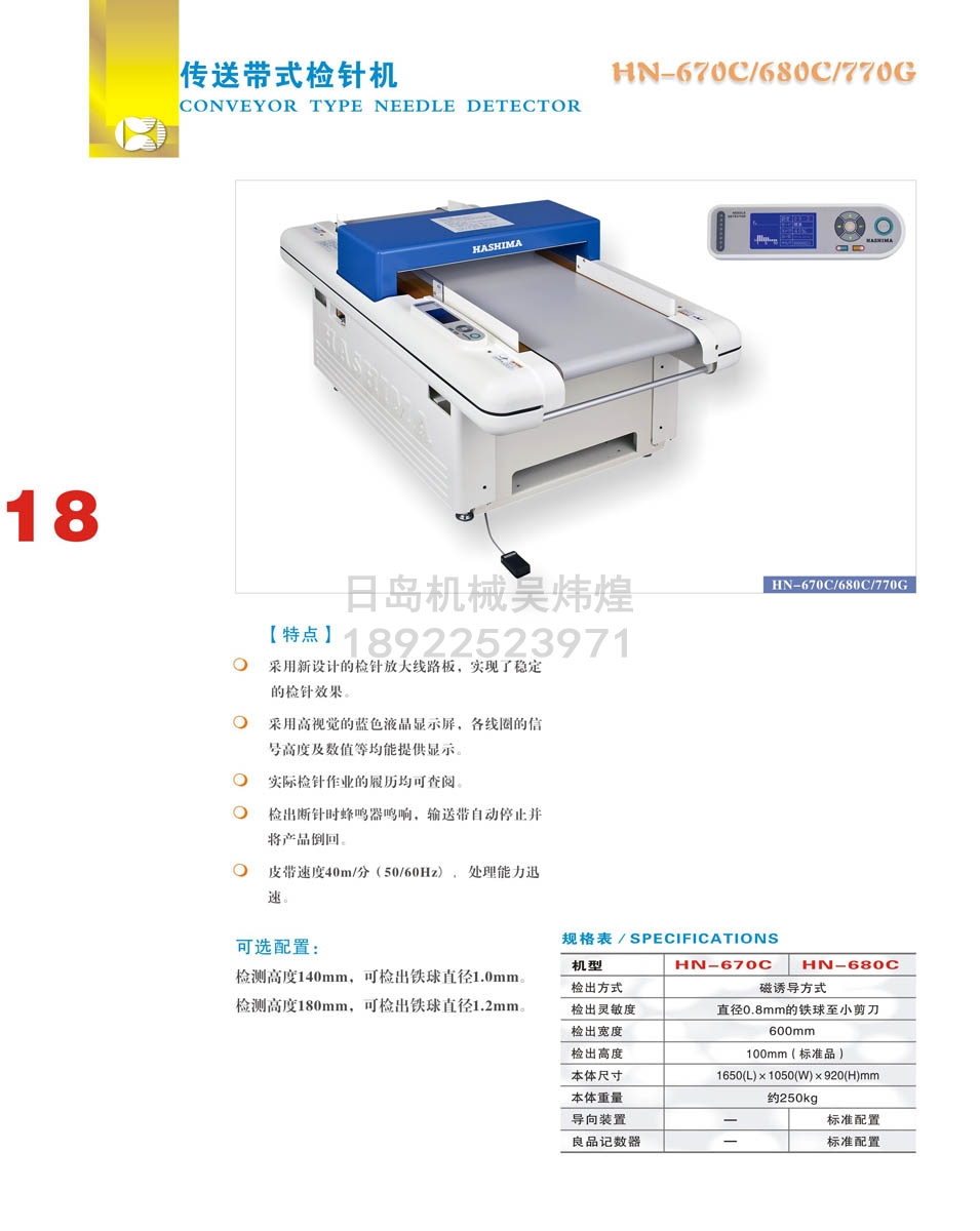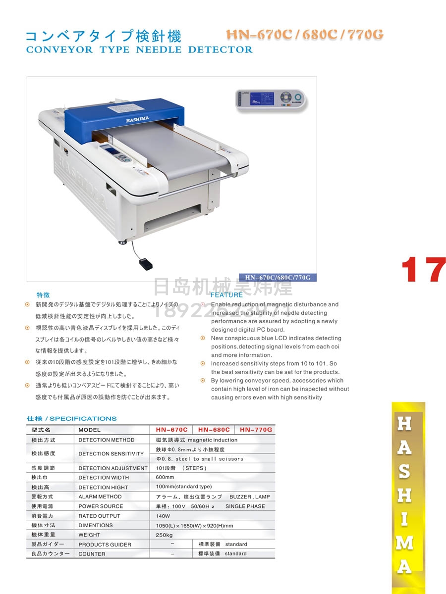 ●新設計數字式電路……一改以往的模擬處理方式,現使用新開(kāi)發(fā)的數字電路板及檢測電路板,實(shí)現了性能穩定運行快速的檢測。由于使用了數字處理方式,故可實(shí)現高精度的檢測。 ●大型藍屏頁(yè)晶顯示器……采用大型藍屏液晶顯示器,機器操作方便可非常直觀(guān)的顯示各種數據。操作者可通過(guò)液晶顯示器讀取機器的靈敏度、預設模式、新檢測模式、節能模式等各種設定模式。同時(shí),機器的作業(yè)存儲信息、語(yǔ)言切換、自診斷模式等都可直接讀取。通過(guò)液晶顯示器顯示的數據可準確的掌握機器的運行狀態(tài)。 ●精密的靈敏度設定……將以往的10級靈敏度更改為100級,使機器實(shí)現更為精密的靈敏度設定。 ●增加了新的檢測模式,在以往無(wú)法使用的工廠(chǎng)環(huán)境中仍可正常作業(yè)。(專(zhuān)利申請中) ●配備有重起功能……不需要重復的手動(dòng)啟動(dòng)機器,在一定的間隔時(shí)間內機器會(huì )自動(dòng)啟動(dòng)。此功能可使檢測工作非常順利的進(jìn)行。 ●節能設計……控制電能的無(wú)味消耗,為地球環(huán)境的可持續發(fā)展而變化。 ●各種診斷模式,使機器的可信性得到了很大的提升……自診斷模式即為,線(xiàn)圈斷線(xiàn)情況下信號輸出衰減的自診斷、“維護者”模式下外界干擾有無(wú)的判斷,使機器的維修、保養工作變得非常容易。 ●檢針作業(yè)過(guò)程的存儲……配備了大容量的存儲器,使檢針作業(yè)過(guò)程得以保存。在檢針作業(yè)管理方面,若有效的使用此存儲功能,可大大提高檢針作業(yè)的??夾?。链撯?ü??郵?荻寥∑骰虻縋蘊崛〖煺牘?淌?藎?貢凈?玫礁?惴?、有效的使又櫍(?or;洌? |