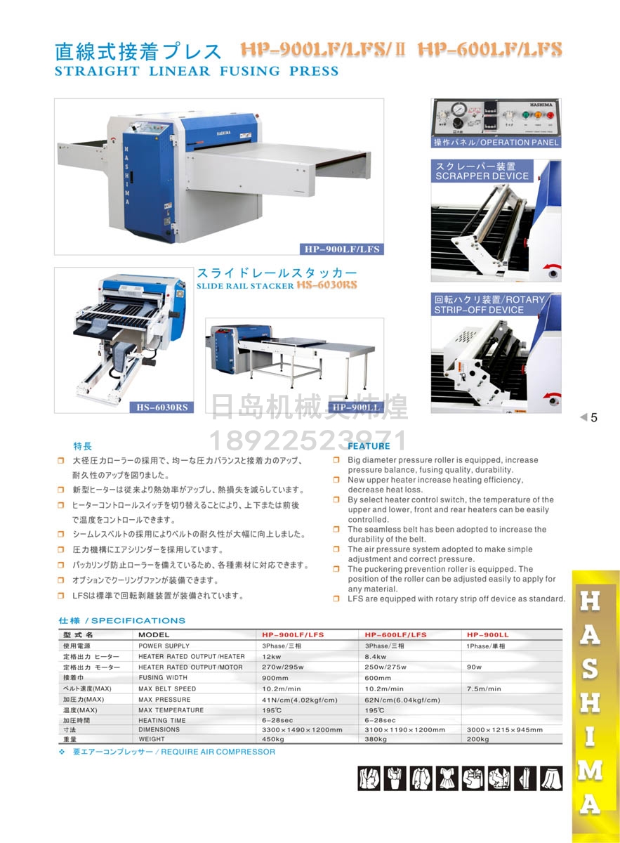 因為是連續作業(yè)方式,可以提高生產(chǎn)效率。 按裝有自動(dòng)蛇行修正裝置,能夠保證上下傳送帶處于相同位置。 采用無(wú)縫傳送帶,提高了傳送帶的耐久性能。另外,產(chǎn)品上不會(huì )因傳送帶接縫兒的存在出現痕跡,實(shí)現了高品質(zhì)的粘合作業(yè)。 分2個(gè)溫度段,分前部和后部控制溫度。 溫度控制可以上下部切換,采用了數碼溫度調節器,能夠正確地進(jìn)行溫度控制。 采用空氣加壓方式,可以簡(jiǎn)單而且正確地加壓。 新型加熱器耐久性能高,溫度分布均勻。 安裝了防止作業(yè)失誤的滾軸。因滾軸可以調節,所以適用于各種面料。 可選配置:冷卻風(fēng)扇裝置。 新型剝離機耐久性好,能夠確實(shí)地將面料從傳送帶上剝離下來(lái)。HP-900LFS標準裝備有回轉剝離裝置。 |
