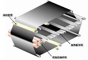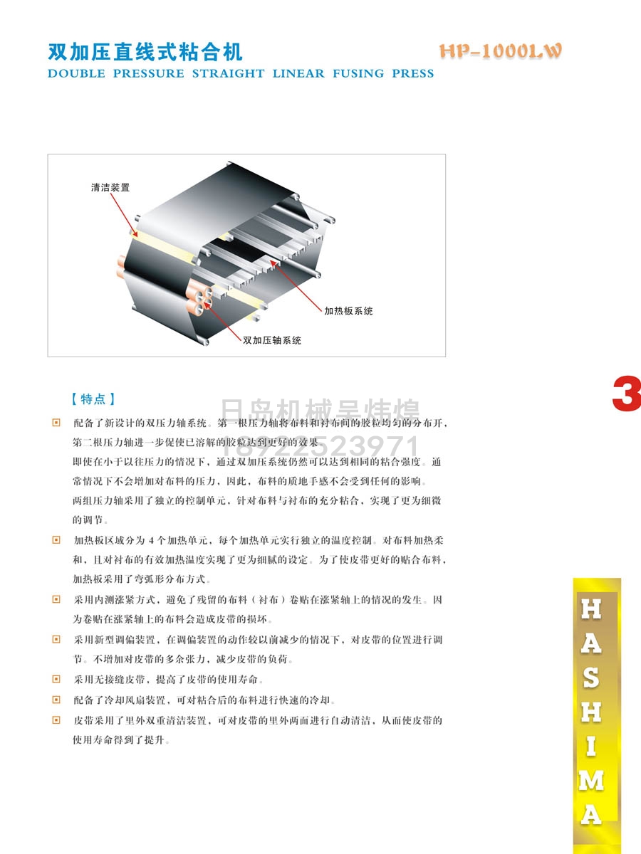 配備了新設計的雙壓力軸系統。第一根壓力軸將布料和襯布間的膠粒均勻地分布開(kāi),第二根壓力軸進(jìn)一步促使已溶解的膠粒達到更好的效果。即使在小于以往壓力的情況下,通過(guò)雙加壓系統仍然可以達到相同的粘合強度。通常情況下不會(huì )增加對布料的壓力。因此,布料的質(zhì)地手感不會(huì )受到任何的影響。兩組壓力軸采用了獨立的控制單元,針對布料與襯布的充分粘合實(shí)現了更為細微的調節。 加熱板區域分為4個(gè)加熱單元,每個(gè)加熱單元實(shí)行獨立的溫度控制。對布料的加熱柔和,且對襯布的有效加熱溫度實(shí)現了更為細膩的設定。為了使皮帶更好地貼合布料,加熱板采用了彎弧形分布方式。 采用內側張緊方式,避免了殘留的布料(襯布)卷貼在張緊軸上情況的發(fā)生。因為卷貼在張緊軸上的布料會(huì )造成皮帶的損壞。 采用新型調偏裝置,在調偏裝置的動(dòng)作較以前減少的情況下,對皮帶的位置進(jìn)行調節。不增加對皮帶的多余張力,減少皮帶的負荷。 采用無(wú)接縫皮帶,提高了皮帶的使用壽命。 配備了冷卻風(fēng)扇裝置,可對粘合后的布料進(jìn)行快速的冷卻。 皮帶采用了里外雙重清潔裝置,可對皮帶的里外兩面進(jìn)行自動(dòng)清潔,從而使皮帶的使用壽命得到了提升。 |