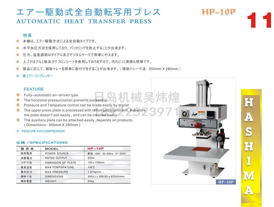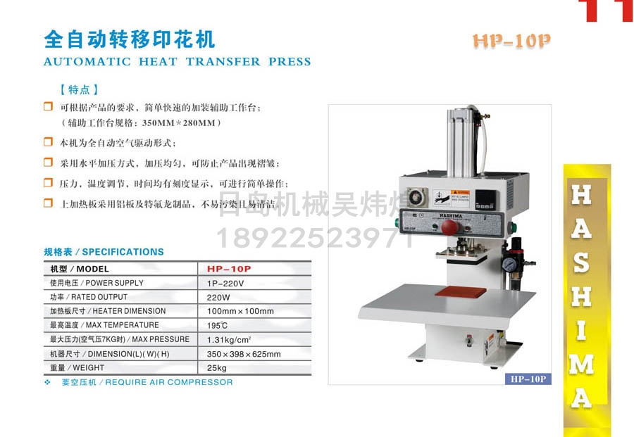 可根據產(chǎn)品的要求,簡(jiǎn)單快速的加裝輔助工作臺(輔助工作臺規格:350MM*280MM) 本機為全自動(dòng)空氣驅動(dòng)形式; 采用水平加壓方式,加壓均勻,可防止產(chǎn)品出現褶皺; 壓力,溫度調節,時(shí)間均有刻度顯示,可進(jìn)行簡(jiǎn)單操作; 上加熱板采用鋁板及特氟龍制品,不易污染且易清潔. |